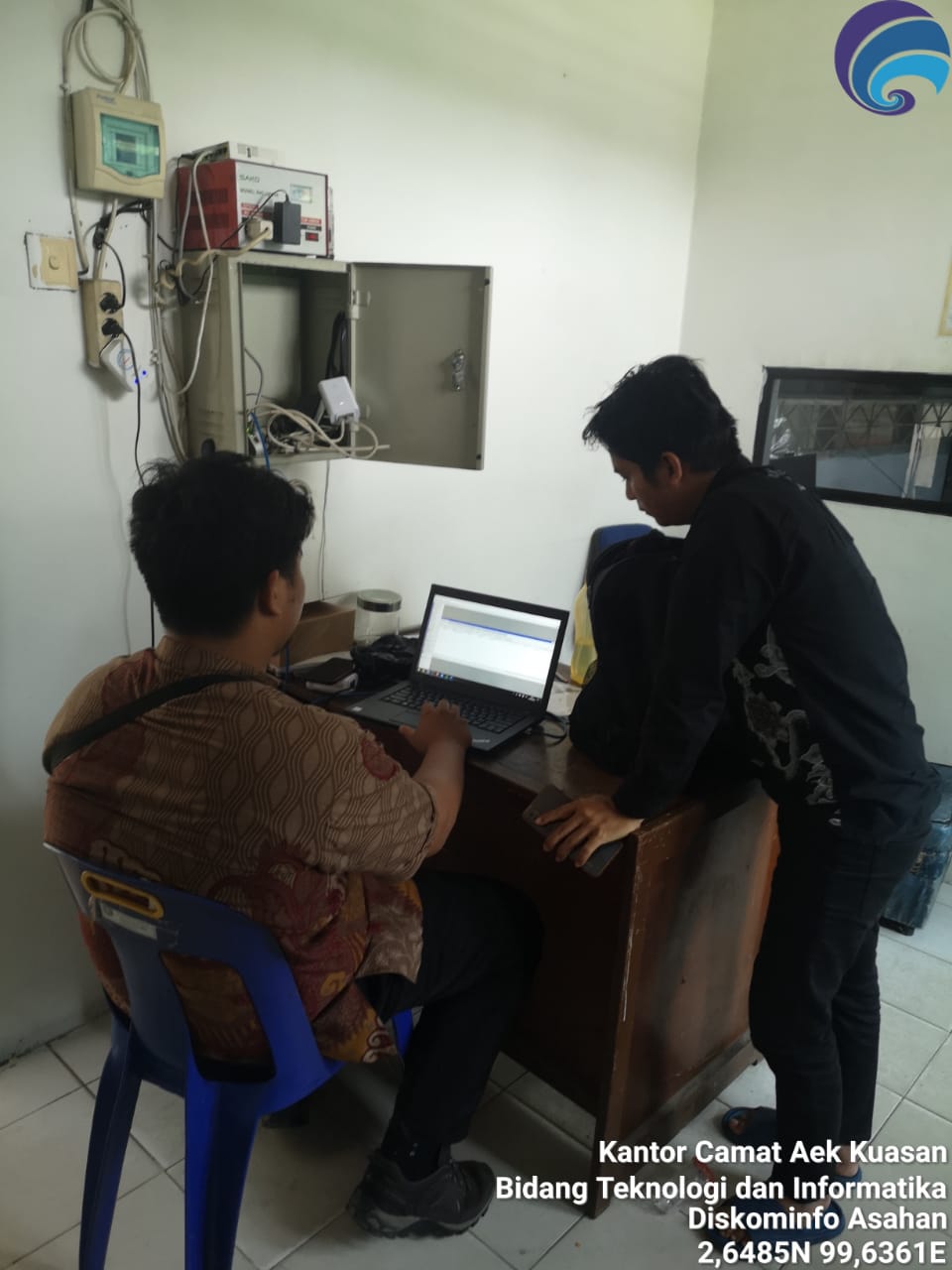 Staf jaringan Bidang Teknologi Informatika Dinas Komunikasi dan Informatika Kabupaten Asahan melakukan penggantian alat pemancar di Kantor Camat Aek Kuasan, Kamis (26/09/2024).